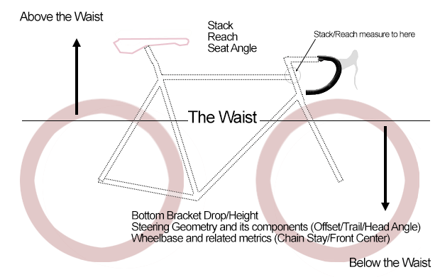 I created this vocabulary some years back; I’ve never heard anyone use it but me; so maybe it’s nonsensical and unnecessary. But I don’t know how better to say it. If you draw a horizontal line that passes through the bike in between the seat or down tube water bottle bosses, that’s the bike’s “waist.”