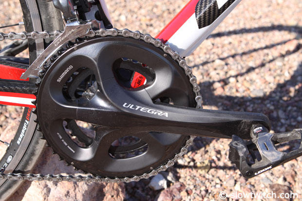 This Shimano Ultegra equipped bike comes indeed with these Ultegra cranks and front derailleur, but the pedals just happened to be on for the Interbike Outdoor Demo.