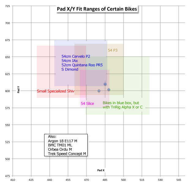 This is an inexhaustive list of bikes. In fact, I just checked as an afterthought, Ramsey is right smack dab in the center of the range for a Giant Trinity Advanced Pro in size S. That bike’s very narrow range for Pad Y is 580mm to 610mm, and Pad X to pad-rear is 415mm to 475mm (this is how Giant measures its Pad Y and X). Take our 485mm to pad-center, lop off 40mm and you get a pad-rear of 445mm which, by cracky, hits the bullseye center of that range.