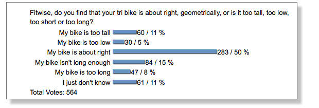 We recently polled Slowtwitchers, and asked them how they fit aboard their bikes and half said about right. About 26 percent said that their bikes are either too tall or not long enough and I suspect those two complaints are often the same complaint. If a bike is not long enough, that may well mean that the next size up is too tall, forcing the rider to ride a lower bike (which means it's not long enough). Only half that number answered in the reverse, that is, "my bike is too low" or "too long."