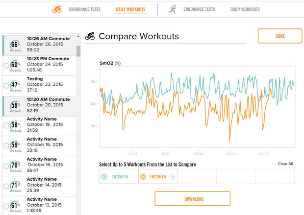 The daily use feature measures SmO2 (muscle oxygenation) along with any sensors you may have paired (e.g. power, HR). Users will be able to compare workouts to see changes in effort/fitness based on SmO2. Below is an image of two similar bike rides with two different efforts. As you can see, the ride on October 20th was a greater effort and it shows with lower SmO2 readings. Presently, real-time SmO2 is being used to better understand effort and recovery time between intervals. As more athletes, coaches, and physiologists have access to this data, I expect the understanding of its uses will continue to evolve.