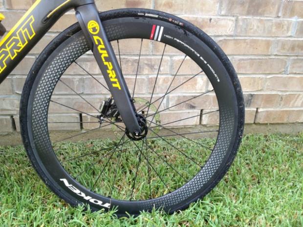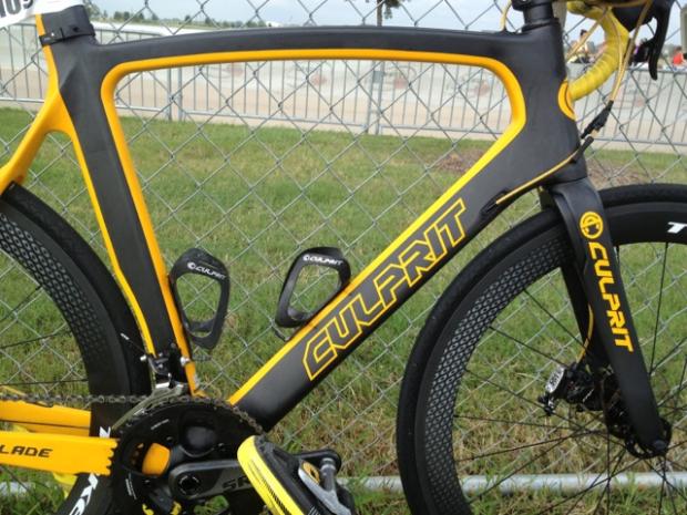 For 2015, Culprit's Croz Blade is being offered to accommodate five different bike set ups in one clean, aero package including: disc brake road bike, rim brake road bike, triathlon set up with rim brakes, triathlon set up with disc brakes (shown below) and a crit bike. One must be a handy mechanic to swap around brake sets but the frame set itself is quite versatile.