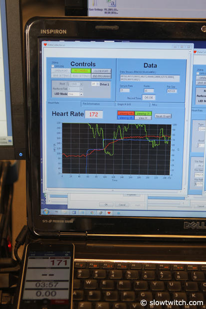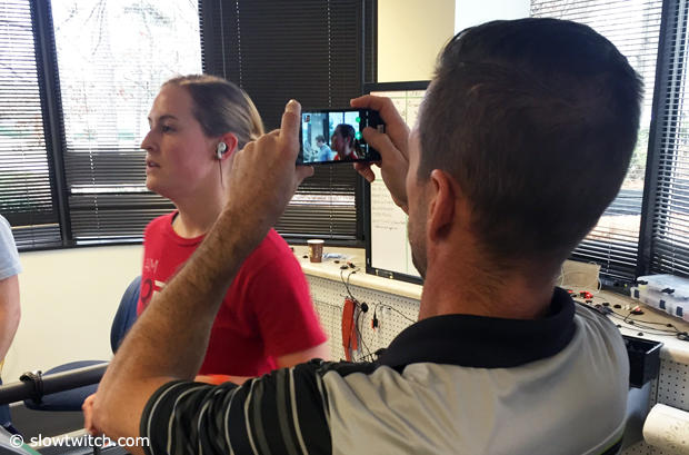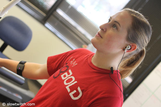 Bethany Stillwaggon is one of the volunteers of Valencell and here she is testing an earbud HR, but also has an armband HR and a chest strap HR running to measure accuracy and compare notes.