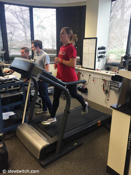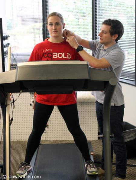 Biometrics Lab exercise scientist Seth Long makes sure the earbud and all other wearable devices are properly in place. Bethany Stillwaggon meanwhile patiently awaits the start of the treadmill.