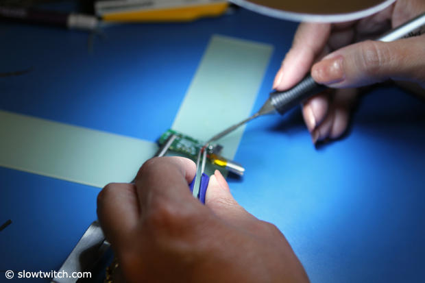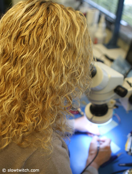 Sheila Holt is one of two test engineers and here she works on some tiny circuit boards.