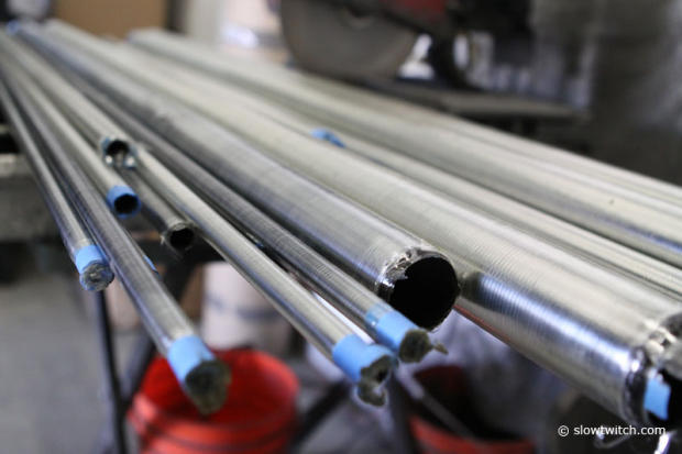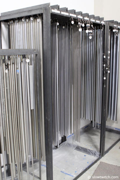 Various diameter mandrels hang on this rack for tubing that is crafted here.