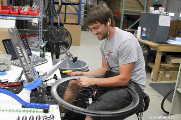 A big number of wheel sets is awaiting shipment to a distributor, but in many cases the wheels are assembled abroad. Here Lona Richmond makes sure all the hubs and spokes are in place for the shipment.