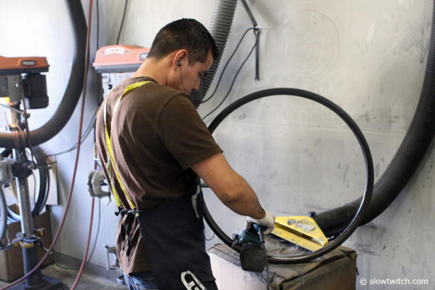 Once the wheel is out of the oven, the mold remnants need to be sanded off. Jose Salazar is cleaning up a rim here.