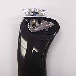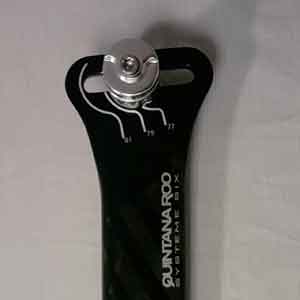 QR's new post (pic just below) is, again, available either in the aftermarket or as an original equipment post. It fits into three models, the Lucero, the Caliente, and the Seduza. The entire mold was reworked between the 08 and 09 seasons, with the seat angle of these three models steepened up a degree (in most sizes, from 76° to 77°). This new post, which comes O.E. on these bikes, further steepens the bikes a couple of degrees or, to be more precise, allows for a wide range of seat angles, as you can see by the slot allowing the post hardware to move fore and aft.