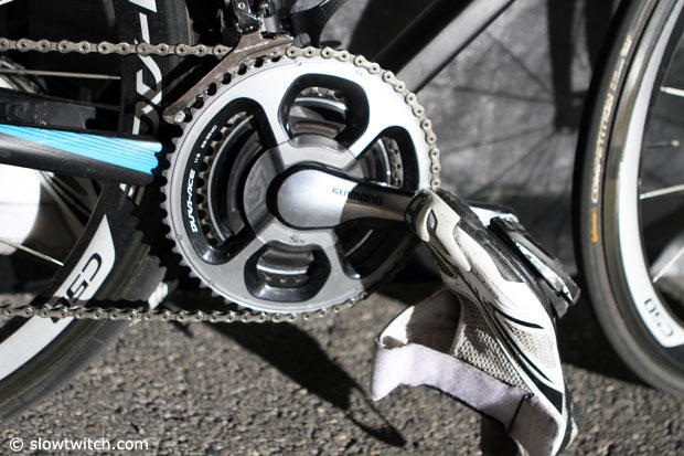 The Shimano Tri shoes were still clipped in, an Royle rides 53/39 chain rings on the 165mm Dura-Ace SRM cranks.