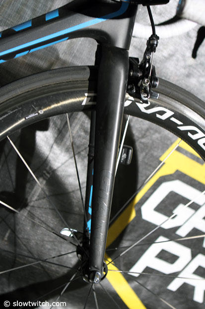 The Giant logo on the TCR fork is subtle black on black.