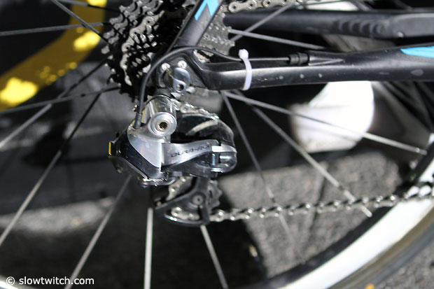 The bike shows signs of heavy training miles, and a zip tie keeps the Di2 cable nice and tight