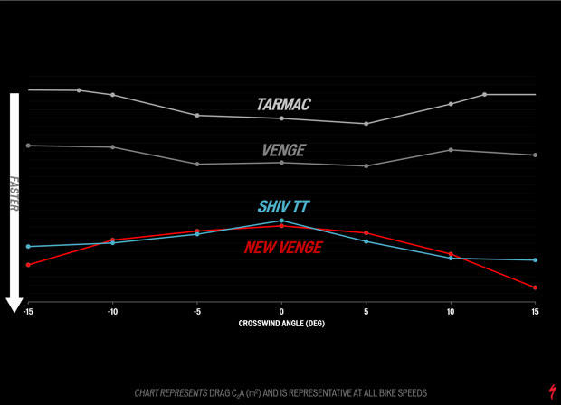 How fast is this bike? Below is a graph showing the Venge ViAS tested against its own product line, including the Shiv TT. Yes, you are reading the graph correctly; Specialized says it measures faster, or nearly as fast, at all yaw angles, even against the Shiv TT.