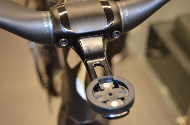 Specialized chose two ways to deal with the Di2 junction box. On the Venge ViAS, when examined from underneath, there's a compartment for the Di2 junction box integrated into the bottom bracket. There's also a stem-integrated mount allowing the Di2 Junction box to be situated under a bike computer with no drag penalty.