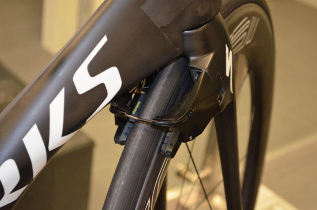 Front and rear brake calipers are impressive, not only from an aerodynamic standpoint but Specialized is also happy with their performance. They looked at V-brakes and the Shimano 9000 brakes but thought they could do even better. This brake system, says Specialized, is equal to or better than the Shimano Dura-Ace 9000 in stopping power and the Manx Missile, Mark Cavendish, appears to agree based on his (Skyped in) comments.