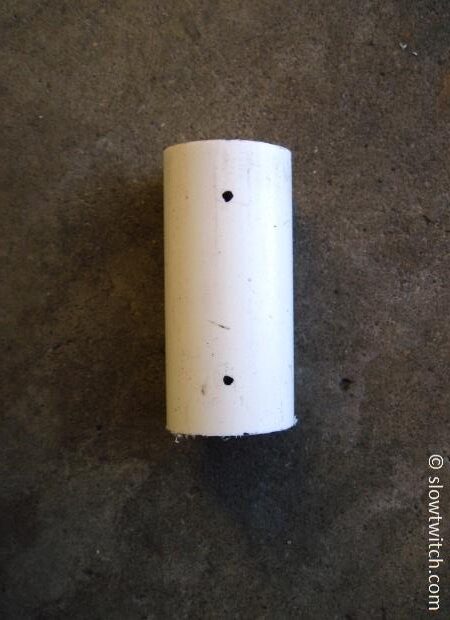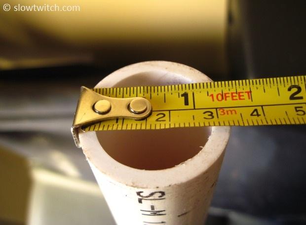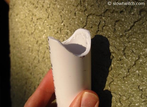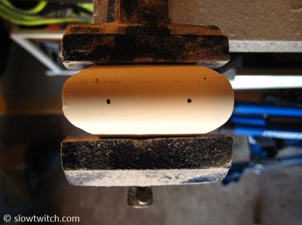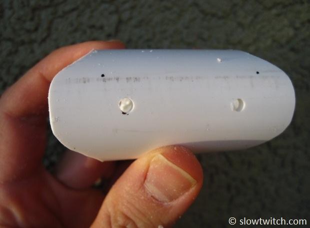 The next step is to drill holes for zip ties. You want these holes to be slightly inboard (say, 5mm) of the narrowest part of the pipe. With my 4.5cm minimum width, this means that I made drill marks about 3.5cm apart:
