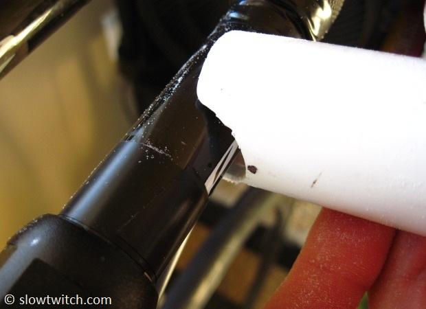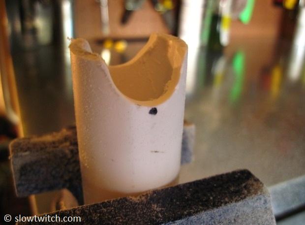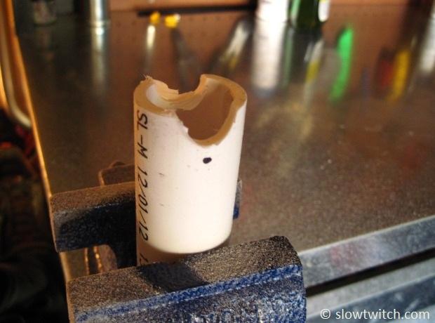 The idea is to carve out notches that will perfectly fit your aero extensions. To do so, I clamped the pipe lightly in a bench vice, and slowly carved material away.