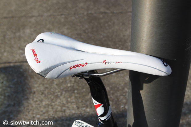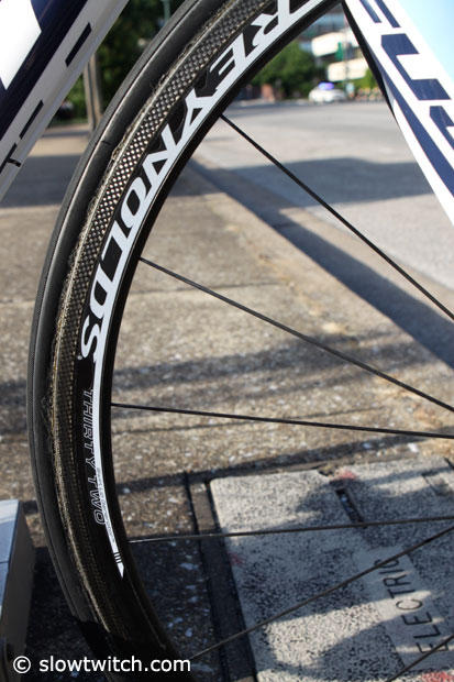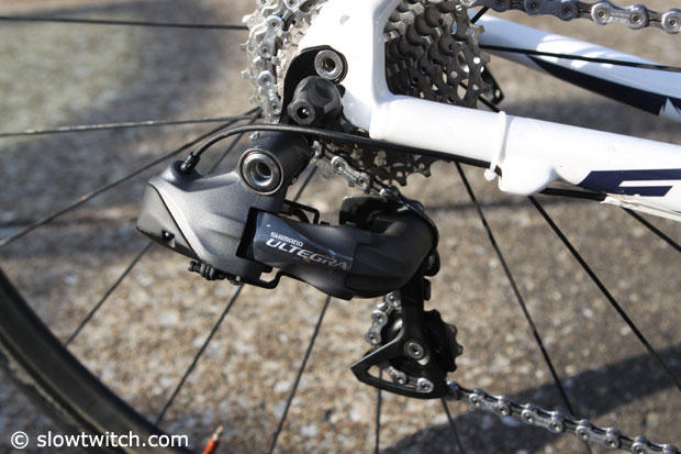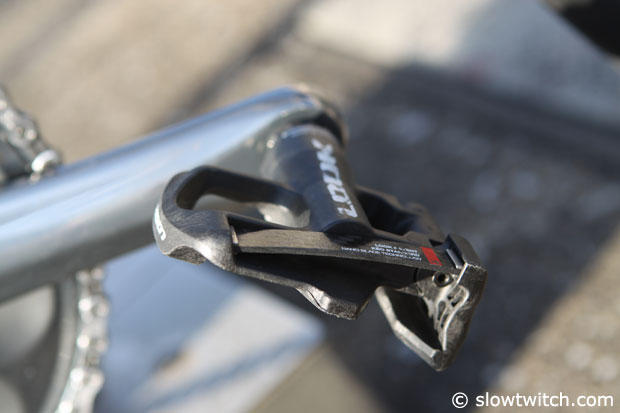 Shimano Dura-Ace SRM compact 50/34 cranks power this machine.