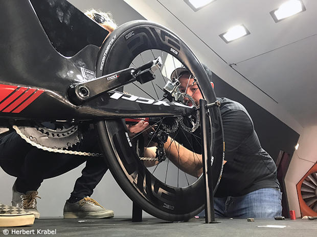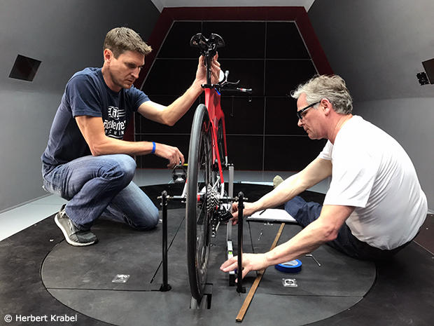 Geoff Eaker had to use his bag of tricks to mount the Cervelo P5X onto the wind tunnel stand. But Eaker will be better prepared next time as he knows that he will likely see more thru axle disc brake bikes coming his way.