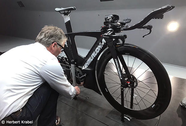 As each new bike came into the tunnel Brian Stover made sure that the bike fit and the position of Austin-Young was matched to the base Felt B2