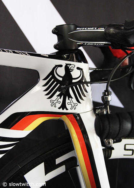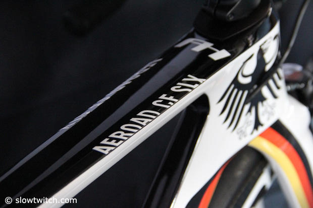 A look at the head tube junction of the Canyon Aerorad CF SLX with the German Eagle on the side and Anne Haug's initials on the top.