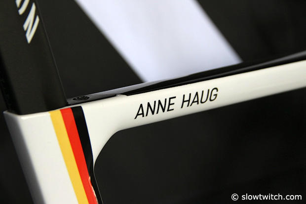 Anne Haug did not race at the WTS event in Hamburg, but her custom painted size XS race bike was on show.
