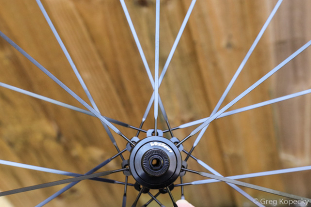 Deeper and wider rims improve stiffness and durability (generally speaking), which allows wheel manufacturers to reduce the number of spokes. While this can go too far, many have settled on a happy medium of 18 front, 24 rear. Another interesting option that I like is rear 2:1 lacing, which ends up with 21 rear spokes (14 drive side, 7 non-drive side). The idea is that, with half as many spokes on the left side of the wheel, it greatly evens out left-right spoke tension disparity caused by wheel dish. As a great example, I’m now testing a set of Vision Trimax 35 wheels (seen above), which uses 2:1 rear lacing. I measured the spoke tension when they were new out-of-the-box, and the non-drive tension is only 20% lower than the drive side – very impressive!