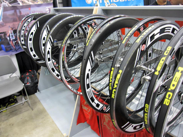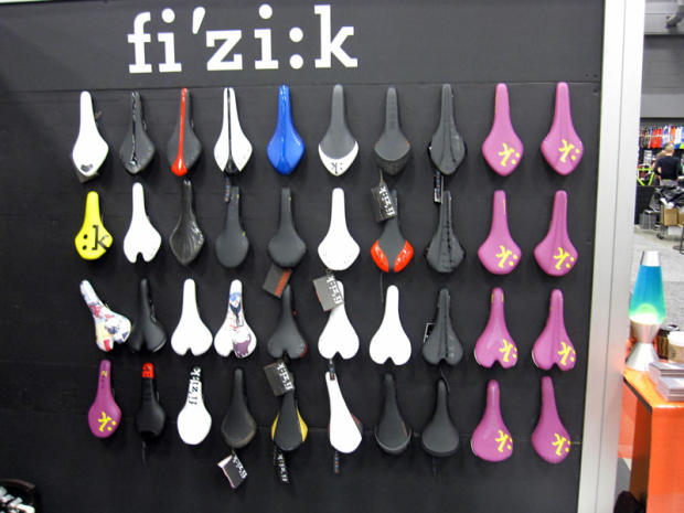 Fi'zi:k saddles were seen on various bikes but also had their own colorful display