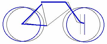That might be done through lengthening the chain stay, as shown in the adjacent image. But that may or may not be practical, depending on whether the custom bike maker employs a faired rear wheel design. Certainly, the wheelbase can be extended by shallowing the head angle and adding offset (rake) to the fork. When you employ both these tactics in tandem, you keep the trail constant. That's what we'll do.