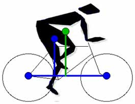 I do not know what that ratio ought to be, and I can't fathom how I would identify someone's center of mass. But to get an idea what I'm talking about, consider the image adjacent. A road rider's wheelbase is illustrated by the horizontal blue line, and it's the distance between the front and rear wheel axles. A road rider, seated, hands on the drops preparing for a turn, might have his center of mass represented by the ball on the top of the vertical blue line. But the triathlete in the aero bars (as this image depicts) will at some point come out of those aerobars and place his hands on the pursuits. When he does, his center of mass will be more representative of the ball on top of the green line. His center of gravity is forward of the horizontal blue line because he rides a steeper seat angle, and his two-dimensional, planar, center of mass is going to be not only further forward, but higher than the road rider's center of mass.