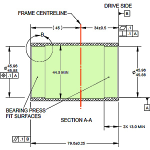 BBRight employs the BB90 idea on the left side of the bike, that is, the non-drive side. On the drive side, it’s like a BB30 bike. Yes, this means Cervelo’s BBRight bikes—like the R3, the S5 and the P5—are asymmetrical at the bottom bracket. The image adjacent is part of a BBRight technical drawing showing the BB from the bottom of the bike. The orange line is the centerline of the bike, the green area represents the dimensions of the bottom bracket shell. The frame is designed to extend laterally 45mm away from the centerline, on the off side, just like a Trek BB90 frame. But on the drive side it's built like a BB30 frame. And, of course, the entire BB is larger in diameter, like a BB30 frame.