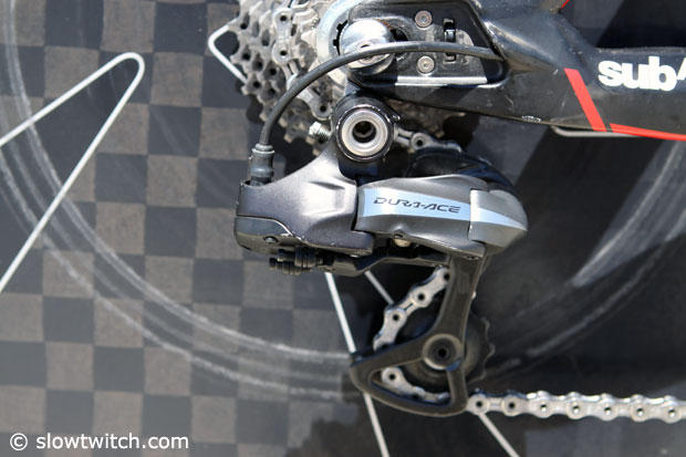The Dura-Ace Di2 rear derailleur has left a mark on the Shimano Pro disc.