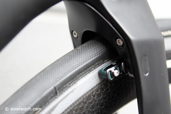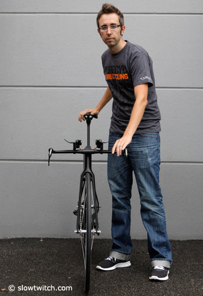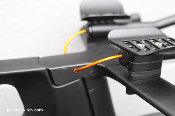 The bike was designed with the Omega Pharma Pro Tour team in mind and will apparently be available in 3 sizes – small, medium and large. The bike we saw in Friedrichshafen was built around a 73 degree seat angle, but we were told that an additional 3 sizes are in the works with triathletes in mind. The bike we are featuring here has been somewhat under wraps at the show, with only the white puzzle test bike inside a glass showcase, but owner Roman Arnold let us spend a few minutes with the black stealth one.