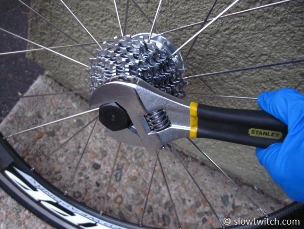 Now it’s time to use that adjustable wrench to unthread the lockring. The splined tool fits in to your cassette lockring, and the wrench turns it.
