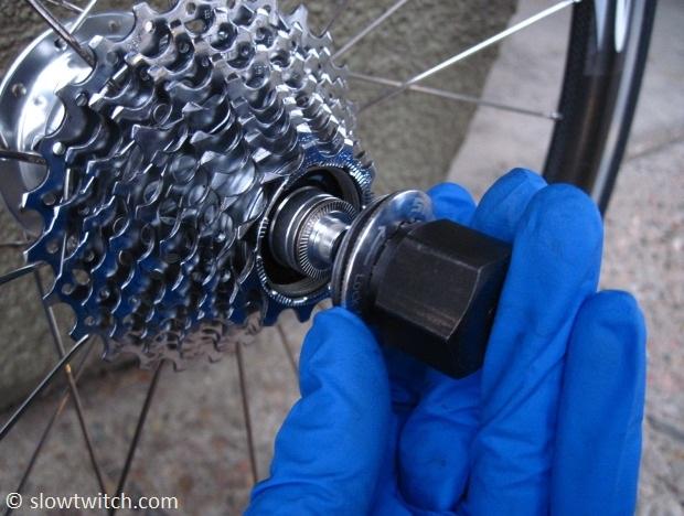 You want to keep track of these spacers. Most cassettes have spacers that are all the same thickness; you can mix them up and it doesn’t matter. However, some cassettes have different width alloy carriers and have a specific order for the spacers (for example, 9-speed Campagnolo cassettes, or some SRAM 10-speed mountain cassettes, such as the 1070 model in larger sizes).