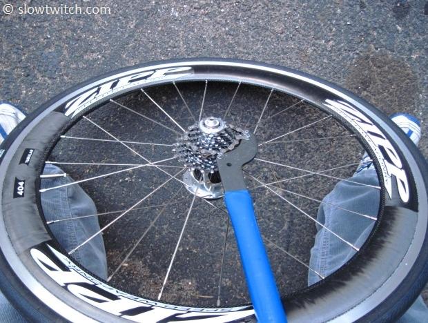 The wheel we’re working with today is a Zipp 650c 404 clincher built with Powertap SL+ hub. The cassette is an 11-26 SRAM PG-1070.