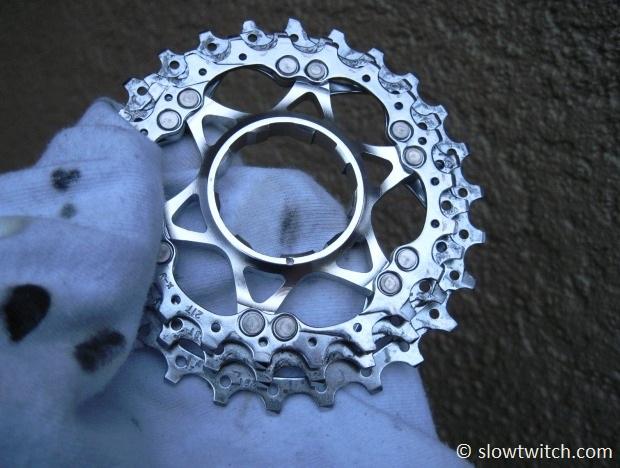 These cassettes do not come apart. What to do? With these cassettes, I don’t even bother with the Simple Green. No, I go to the full-on heavy duty brake parts cleaner. I lay the cassette on an already-dirty rag, and hose it down. Then, I use the ‘floss method’. Repeat until it’s clean, or you’re tired of trying. The unfortunate reality is that you can never get these things quite as clean as a normal cassette. That’s life.