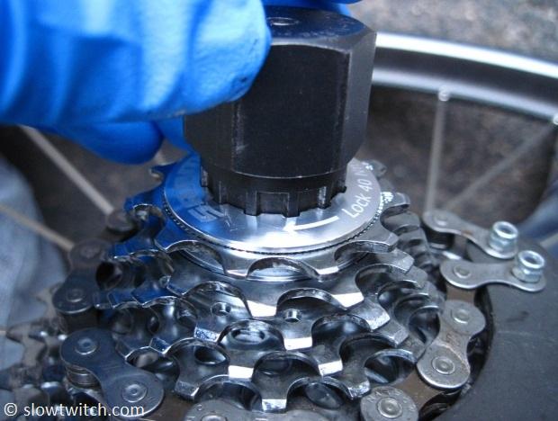 Note – since we’re tightening the lockring in the clockwise direction, you do not need the chain whip anymore (the freehub pawls will keep it from turning).