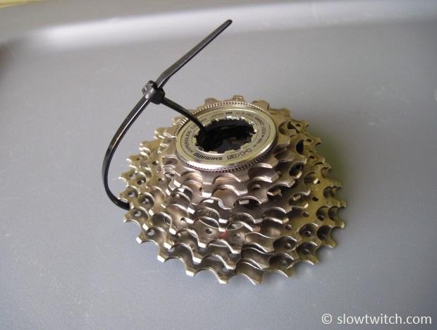 If your cassette does have different widths or amounts of spacers between cogs, keep track of the order you take everything off. The high-tech method of doing this requires a special device: a plastic zip-tie.