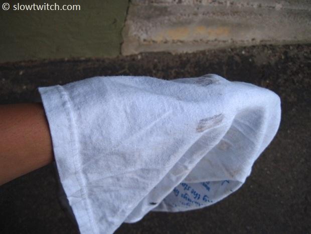 This saves weight, but complicates the cleaning process. Fear not, my friends, as there is an easy solution. Take a clean section of rag, and place it over your forearm. Spray the rag with your solvent.