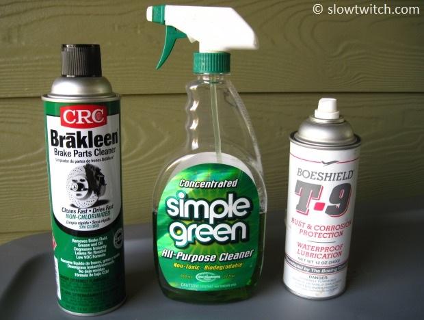 My go-to for general cleaning is Simple Green. I mix it 1:1 water-to-Simple Green. This tackles most cassette jobs. You can use any general household degreaser. The other two products – automotive brake parts cleaner and Boeshield T9 – are for heavier cleaning, which we’ll discuss later.