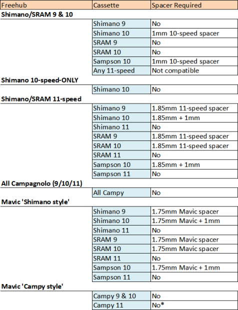 *Some early Campy-compatible Mavic wheels require a very small 0.55mm spacer behind Campagnolo 11-speed cassettes in order to clear the right hub flange. Newer versions of their wheels feature slimmer flanges and do not require the spacer. If your wheel is in-question, give Mavic a ring or see your local dealer for assistance.