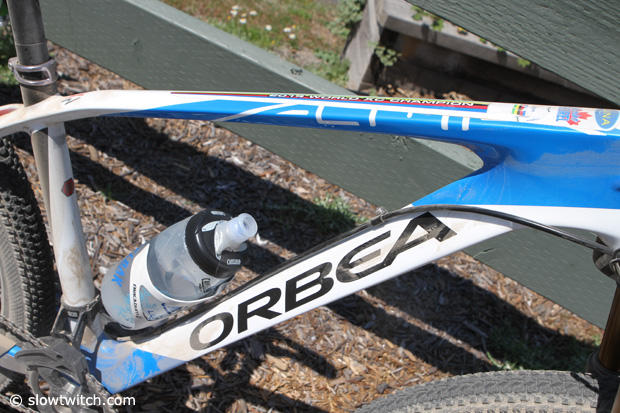 A single water bottle cage on the curvacious lines of this Orbea Alma. And clearly the bike is ready for a bath and some tender love.