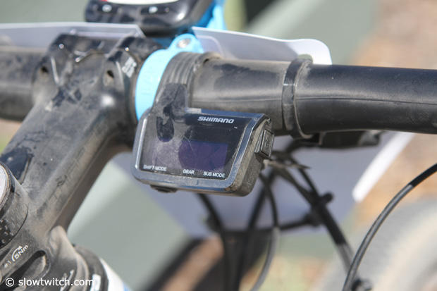 The Shimano XTR Di2 display got dusty enough during the Sea Otter Classic XC apparently forcing Pendrel to wipe some dust of it.
