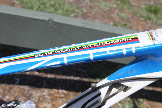 In addition to the world champion rainbow stripes on her race kit, she also has a few nice touches along those lines on her bike.