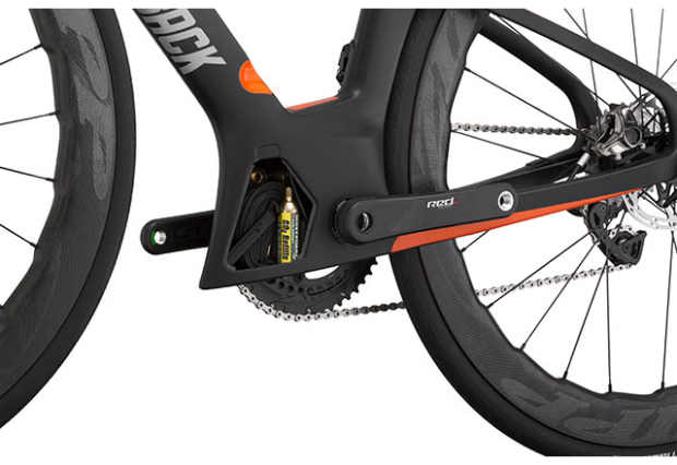The Diamondback folks consider the bike as discrete problems – or opportunities – and fashion solutions accordingly. The front of the bike, more or less above the top tube and extending above and in front of the head tube, is the Cockpit. Below the top tube is what DB calls the Speed Core. See those orange circles in the frame? These are Vortex Generators which are at the heart of what DB calls its Wake Control System. The Vortex Generators, “significantly reduce the wake that leaves the bike.”