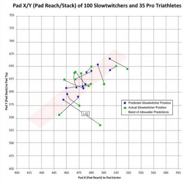 Note that you fit into a band. The deep green line is a slope that is the mean. The lighter green line is the range of allowable positions this prescriber generates based on the differences in morphologies. All Slowtwitchers using the Diamondback fit calculator are going to fit inside the wider green band (except "Duckies" above, who was robbed of a torso at birth). Just notice that the blue dots are where you really ride, so either the calculator is telling you where you ought to ride, or it’s tell you to ride in a place you’re not capable of riding. Which is it? Good question. Let’s talk more about it.