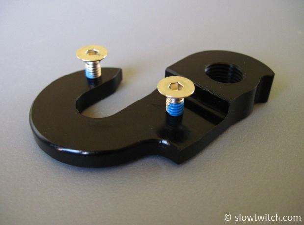So that means that replaceable hangers are always better, right? Yes and no. Smart designers of replaceable hangers make them out of material that is softer than the frame (so the hanger bends before the frame does). They usually attach to the frame with one or two bolts. Some use a chainring nut, and others use small bolts that thread in to the hanger itself (so if you strip one out, you can replace the hanger – and not the frame). A good example of the latter is the spare hanger for my Niner mountain bike: