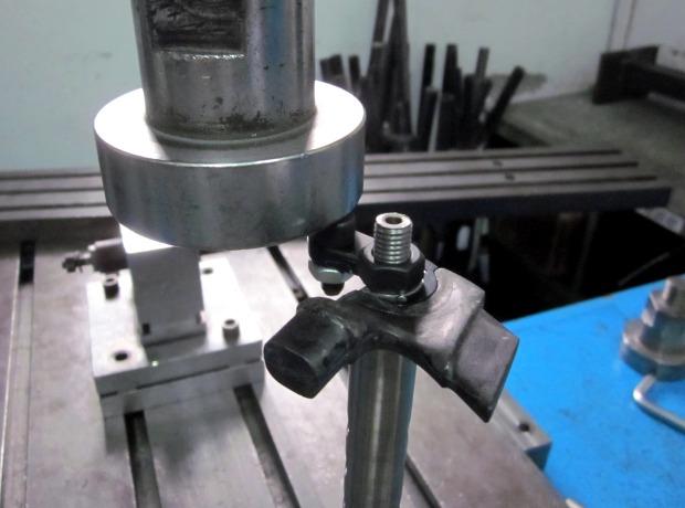 This image shows one of Cervelo’s derailleur hanger test machines. As you can see, the dropout gets bolted down, as though there was a hub clamped in it. The cylinder presses down from above, simulating the force that a bike would see in a right-side crash or bike travel case.