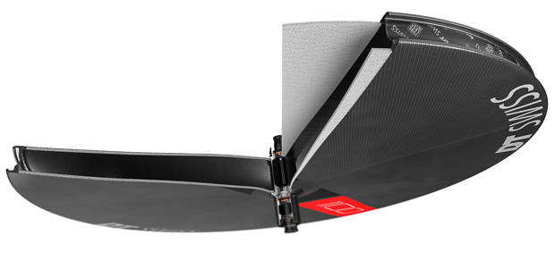 The carbon disc surface was designed in conjunction with DT’s aerodynamic partner, Swiss Side. It includes eight glued carbon pieces of equal size, aligned symmetrically. The overall wheel shape is asymmetric right-to-left, with a flat right side (to make room for the cassette) and slightly convex left side.